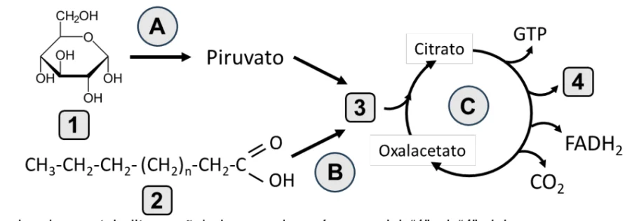 b) Asignar hasta 0,5 puntos por nombrar las vías “A”=glucolisis, “B”=-oxidación y “C”=Ciclo de Krebs, y dar explicaciones